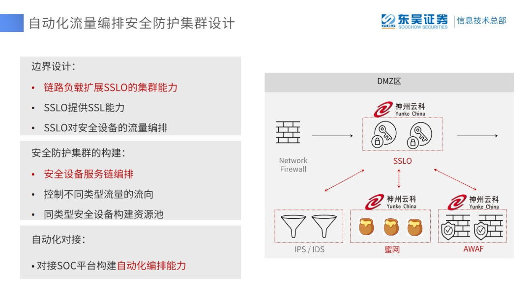 為了更好的應對數(shù)據安全挑戰(zhàn),滿足監(jiān)管需求,保障應用可持續(xù)性,東吳證券采用leyu.樂魚安全流量編排解決方案。將原有串接部署的DDoS、防火墻、WAF、防毒墻、以及旁路的IDS,邏輯旁路部署在安全流量編排設備旁邊,使安全能力服務化。