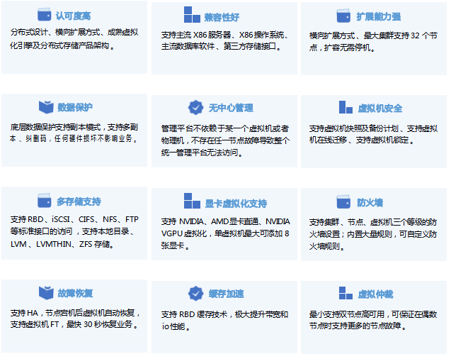 虛擬化場景融合計算和存儲資源,提供具有極簡 、高效 、可靠的虛擬化環(huán)境 。提供 OS 一鍵式交互安裝,支持業(yè)務的快速上線,靈活擴展 。對各類資源統(tǒng)一管理,按需分配,支持一鍵巡檢 、歷史性能數據統(tǒng)一監(jiān)控 。支持第三方虛擬化管理平臺 、CDP 保護平臺 。支持數據多副本及 EC 技術 ,大幅提升用戶可得容量 。提供多種安全可靠策略 ,HA 高可用 、備份計劃,虛擬機保護,保障業(yè)務連續(xù) 。